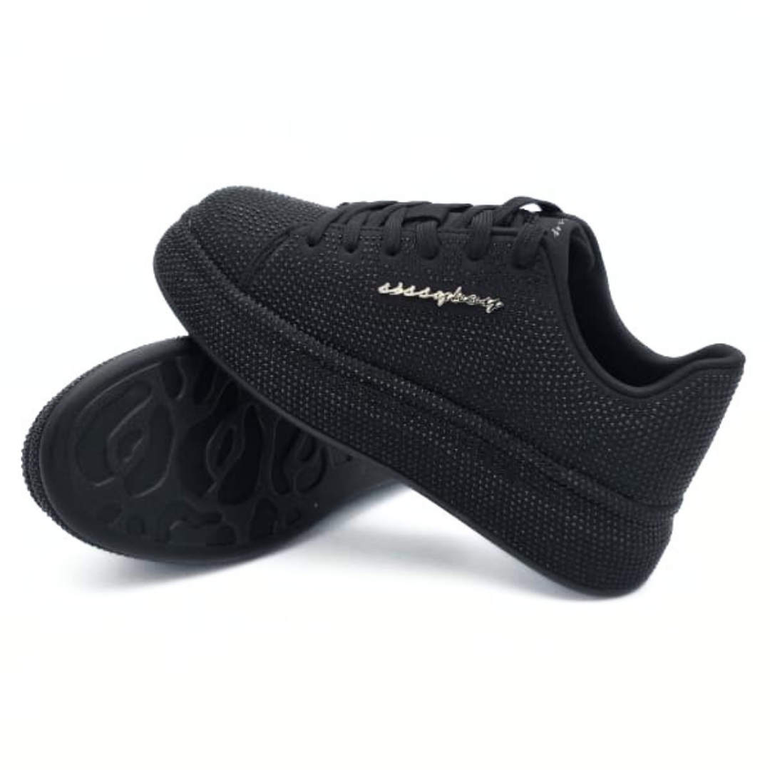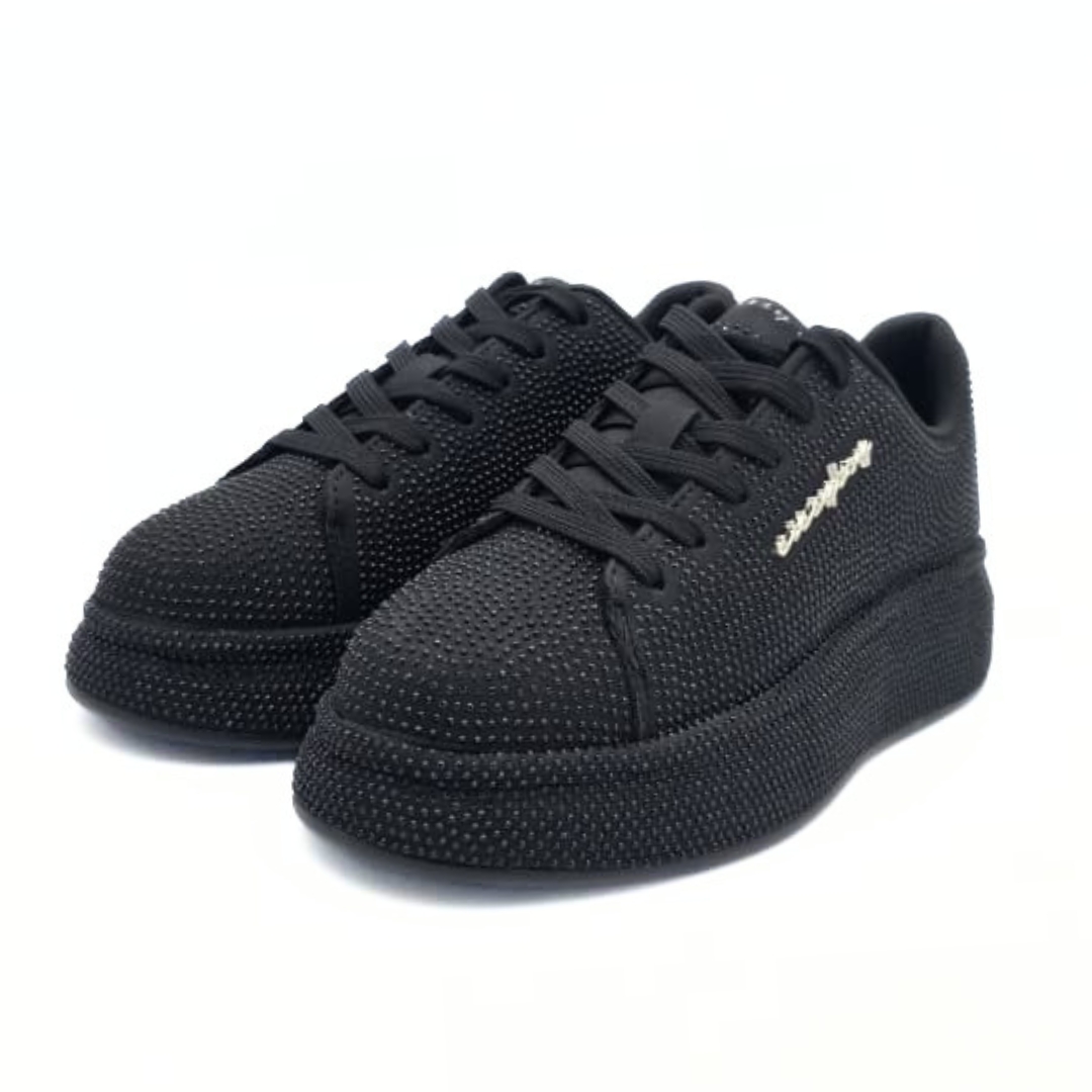 Emblazon Sneakers bring together bold sparkle and sleek sophistication in one standout design. Set on a dark-toned base and finished with all-over diamante detailing, these sneakers catch the light beautifully while keeping their look refined and versatile. The contrast between the shimmering embellishment and deep colour creates a striking effect that adds texture, glamour, and modern edge to every step. Perfect for elevating casual outfits or adding a touch of shine to your everyday style.