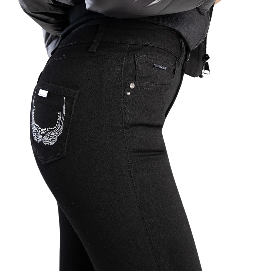 The standout wing embroidery on the back pockets, finished with delicate bling accents, adds a touch of subtle sparkle-elevating a classic denim essential with refined detail. Whether styled with sneakers for a casual daytime feel or heels for an evening out, Laura brings the perfect balance of edge and elegance.