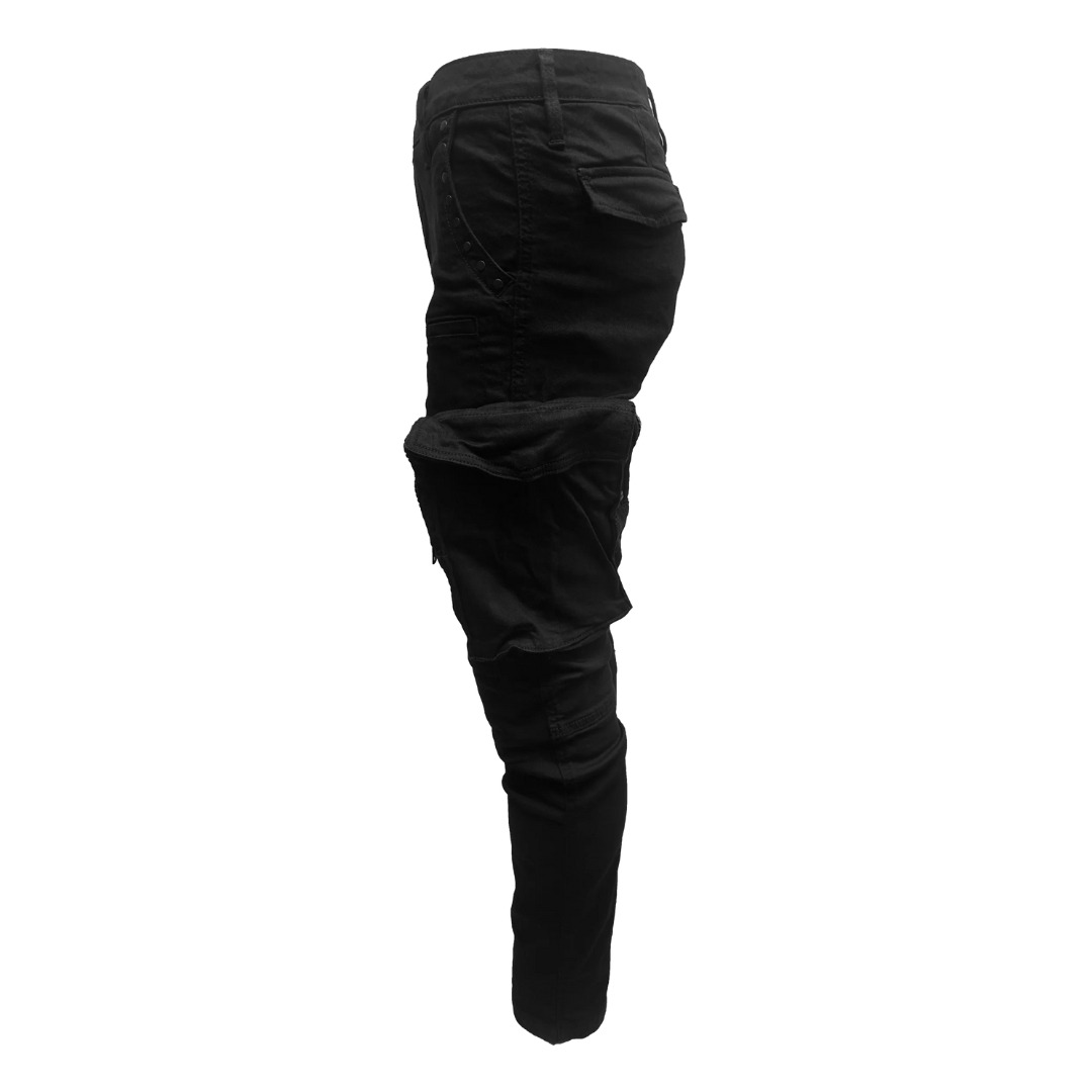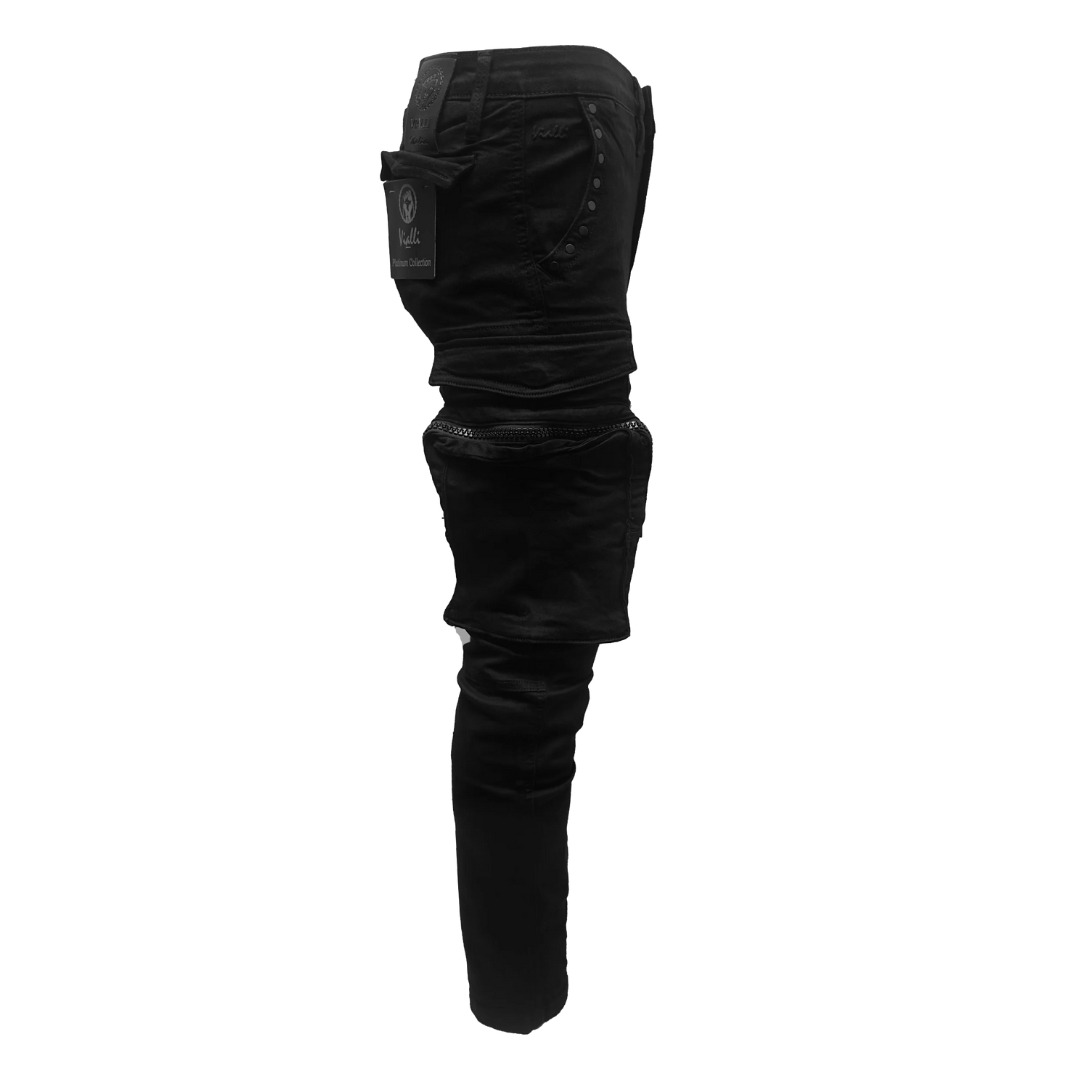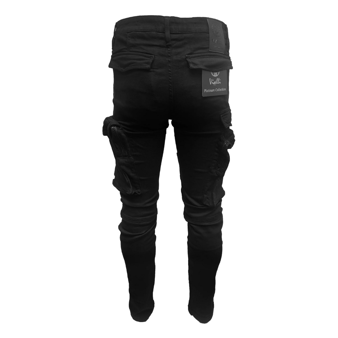 A signature Vialli back tag anchors the look, while eye-catching decorative studs on the front pockets add a bold style edge. The unique kangaroo-style leg pockets introduce a touch of utility flair, making this piece both fashionable and practical.