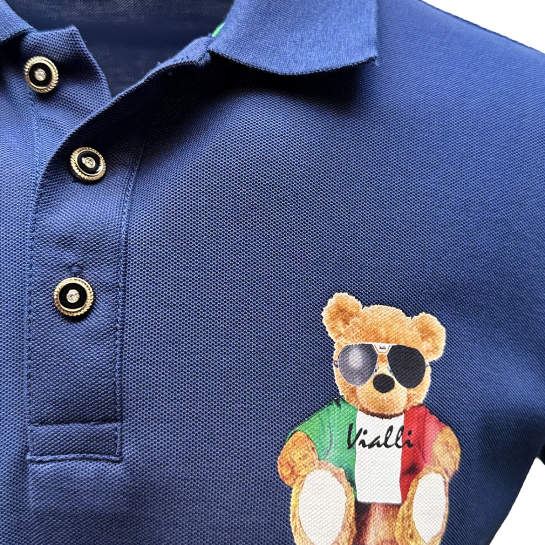 Vialli Kresta Golfer brings together effortless summer style and everyday comfort. Made from 100% cotton, this premium golfer offers a soft, breathable feel that keeps you cool and comfortable all day long. Designed with a classic collar and button-down front, it delivers a clean, refined look, while the iconic Vialli Teddy emblem on the chest adds a signature touch of luxury. Finished with a plain back for a sleek silhouette, this versatile piece is perfect for both smart-casual outings and relaxed weekend wear.